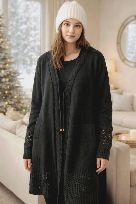 مانتو جلو باز بافت مشکی زنانه – استایل زمستانی با جزئیات خاص